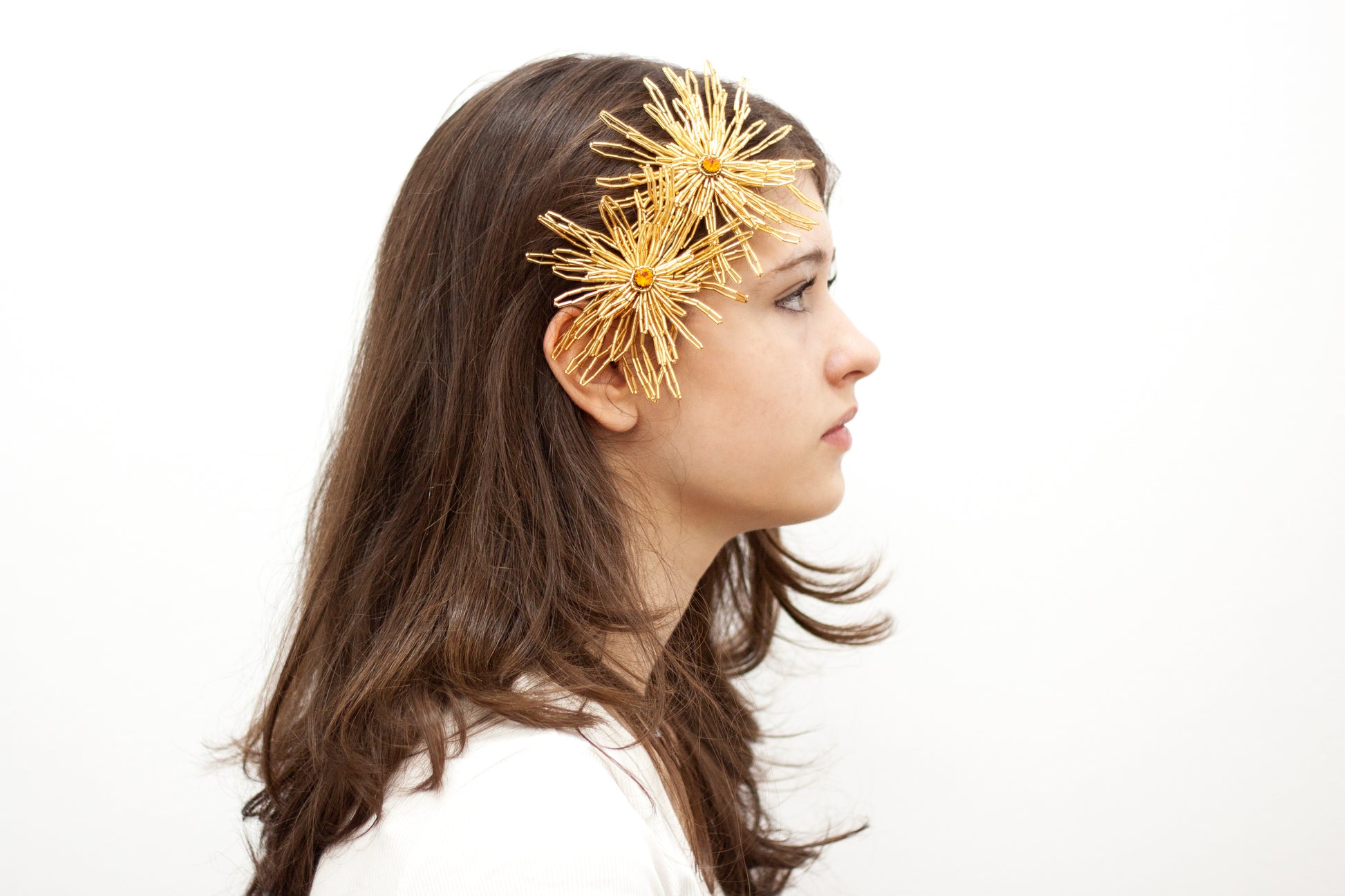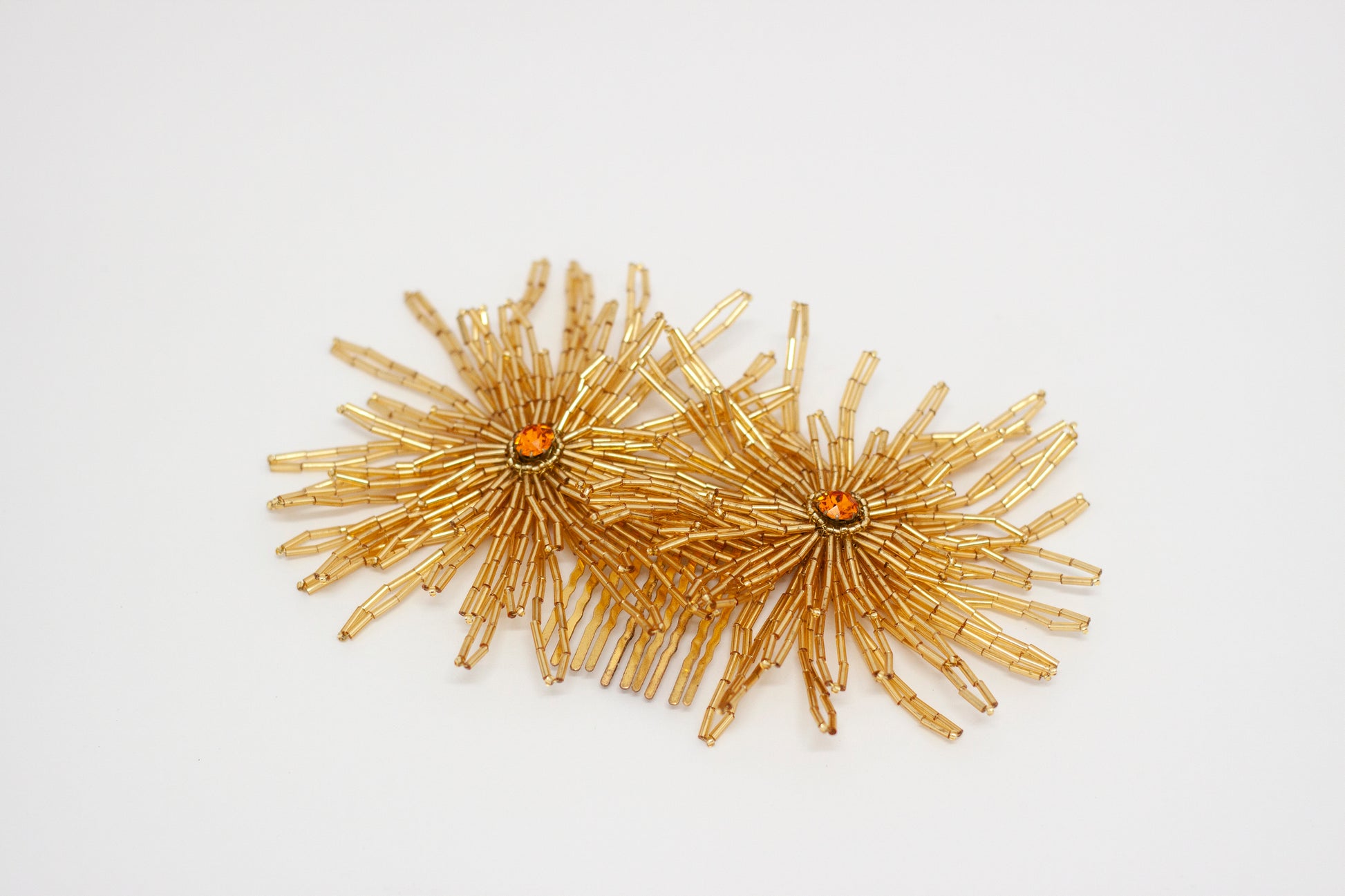 Este tocado de flores doradas es una pieza que irradia luz y sofisticación. Su diseño combina la delicadeza de la naturaleza con el brillo atemporal del dorado, evocando feminidad, elegancia y fuerza interior. Cada flor, trabajada con detalle, simboliza belleza en plenitud, convirtiendo este accesorio en el complemento perfecto para realzar momentos únicos con un resplandor inolvidable.
